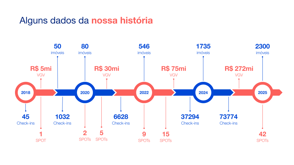 Desde 2018, crescemos de forma acelerada, consolidando liderança no mercado de aluguel por temporada. Nesta linha do tempo, mostramos a evolução da nossa operação